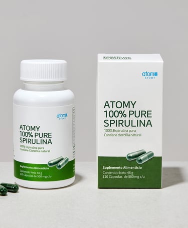suplemento alimenticio de spirulina 100% pura, formulado para aportar nutrientes, antioxidantes y apoyo al bienestar general de forma natural.