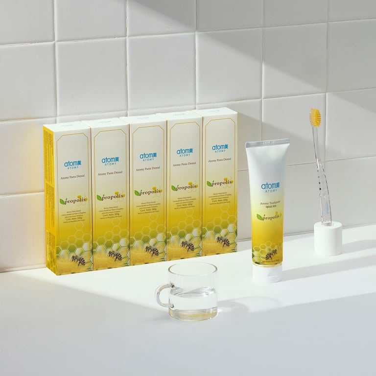 Pasta dental con propóleo y té verde que ayuda a cuidar dientes y encías diariamente.