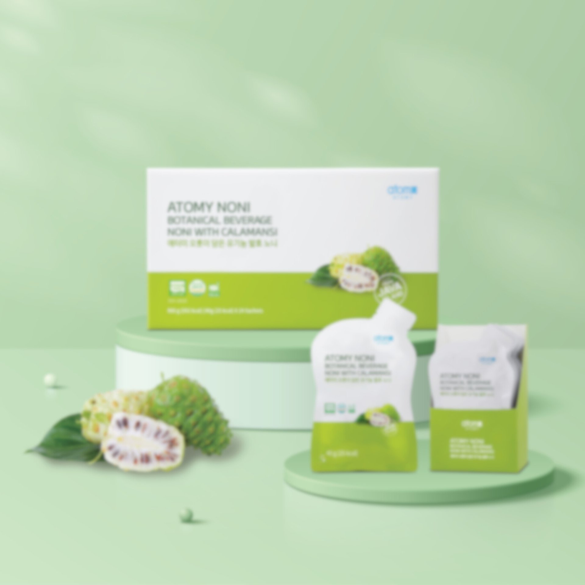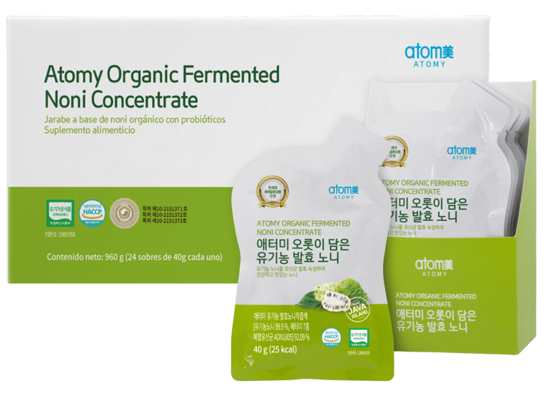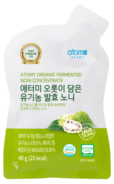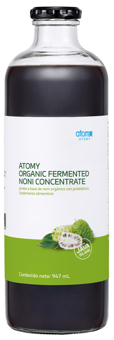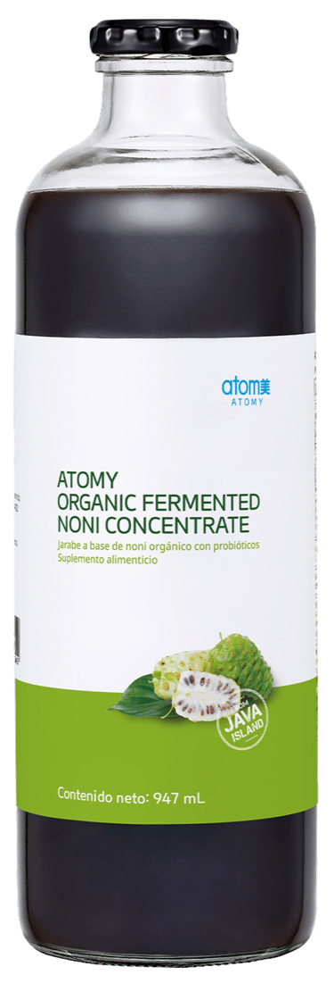 Contiene Noni 100% orgánico cosechado en una granja exclusiva de Atomy en la Isla de Java, Indonesia.
